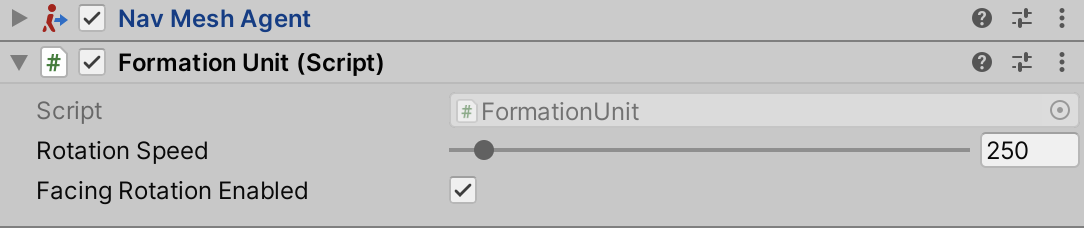 3. Then use the provided <mark style="color:blue;">**FormationUnit**</mark> component and enable or disable built-in rotation capabilities after unit has reached it's formation position.